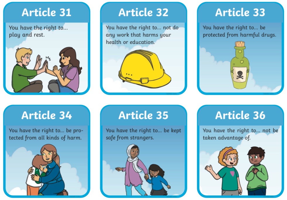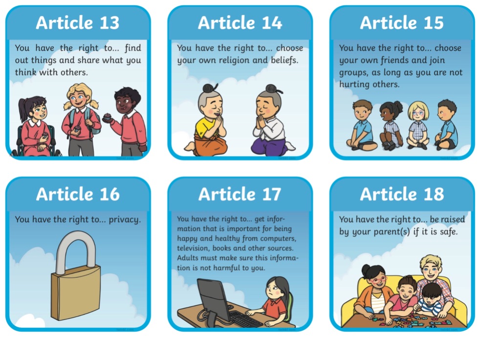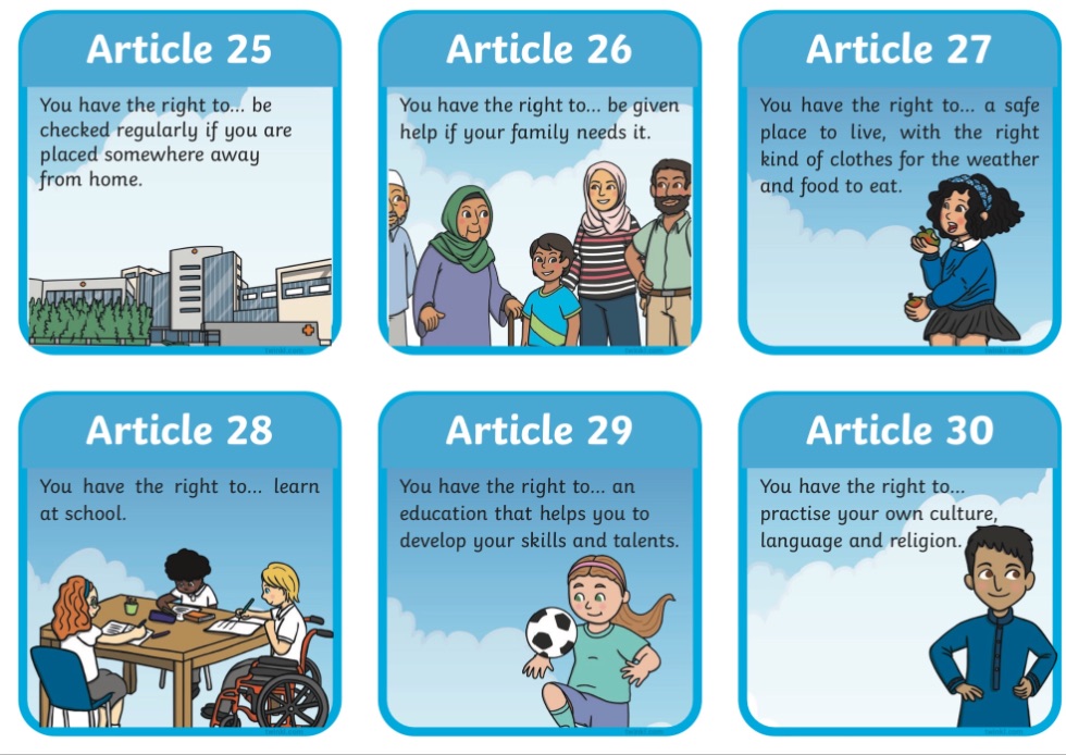 Article 2 - 'All children have all these rights, no matter who they are, where they live, what language they speak, what their religion is, what they think, what they look like, if they are a boy or girl, if they have a disability, if they are rich or poor, and no matter who their parents or families are or what their parents or families believe or do. No child should be treated unfairly for any reason.'.